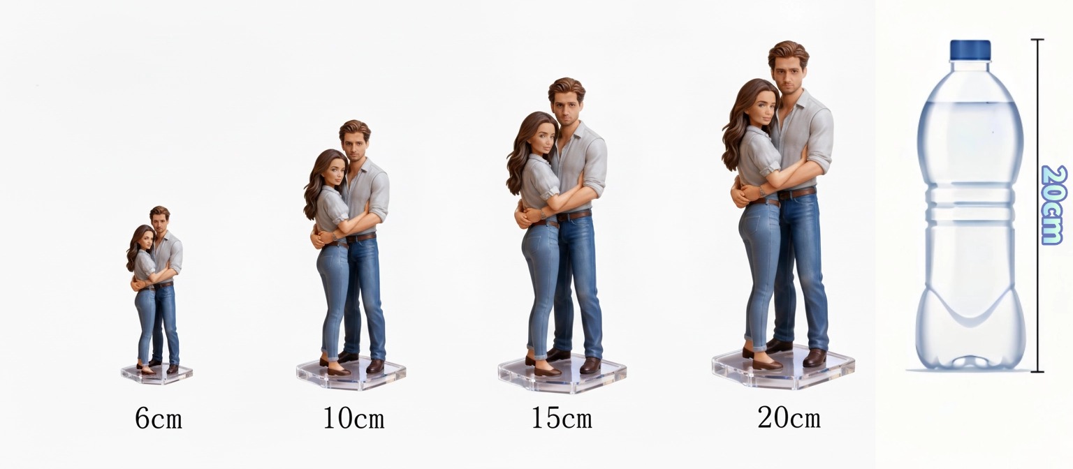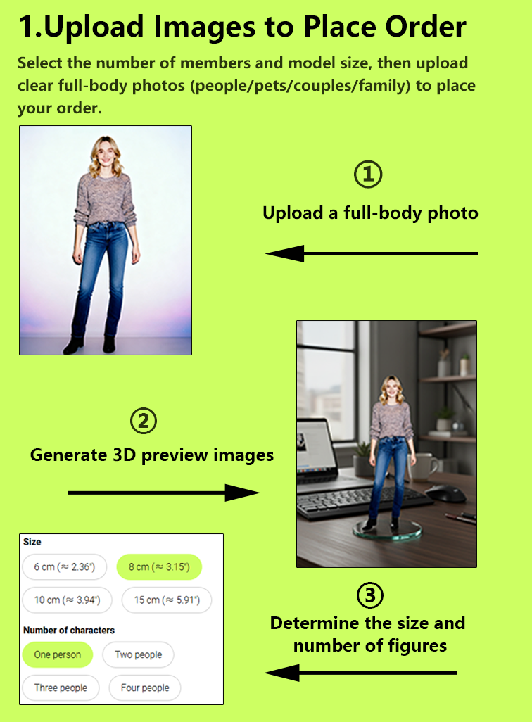 For full-body figurine, a full-body photo is required for more accurate 3D modeling. For multi-person full-body figurine, a group photo of all members is also required.