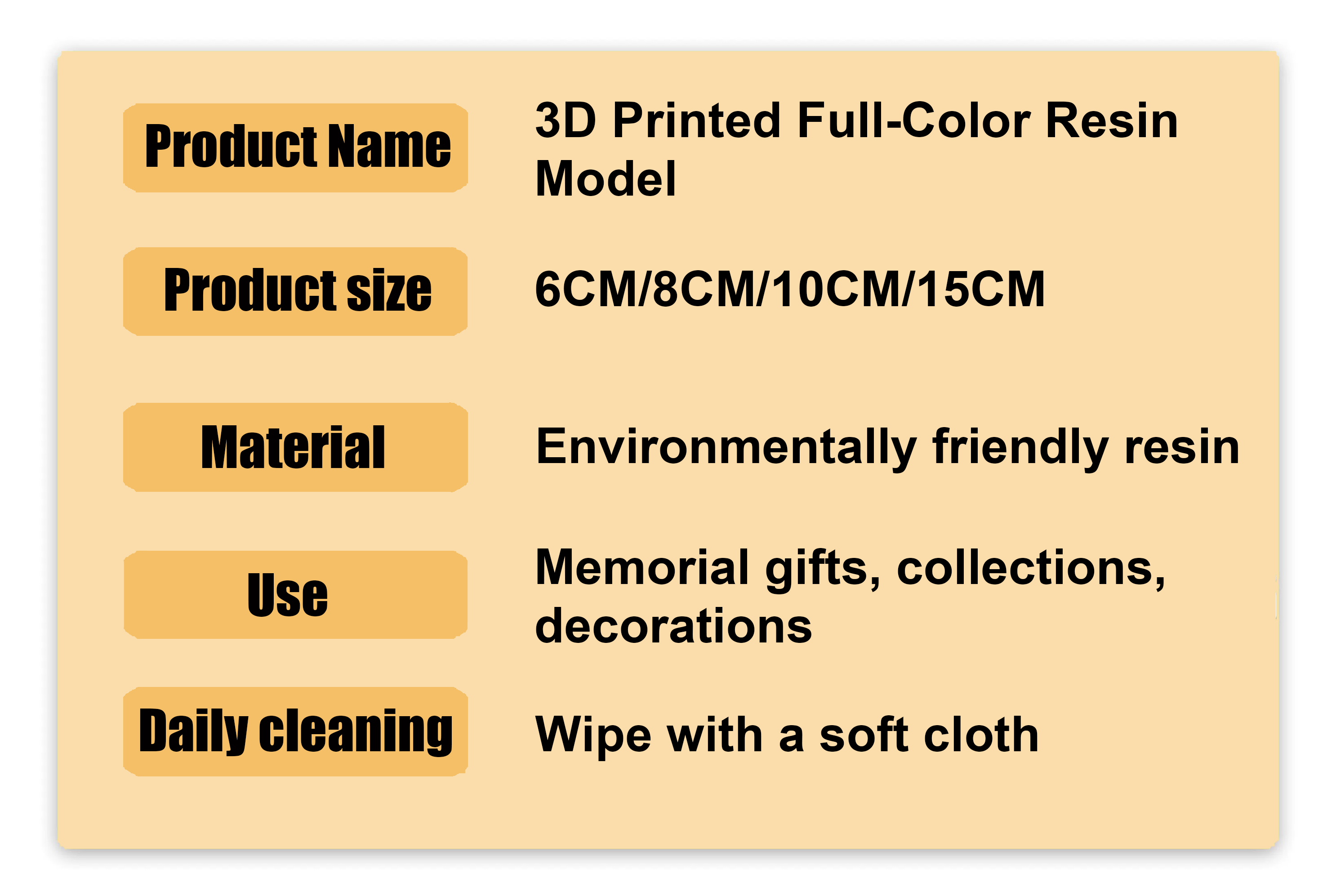The figurines are printed in full color resin, a single-piece molding process, requiring no subsequent manual painting. A wide variety of colors are supported.